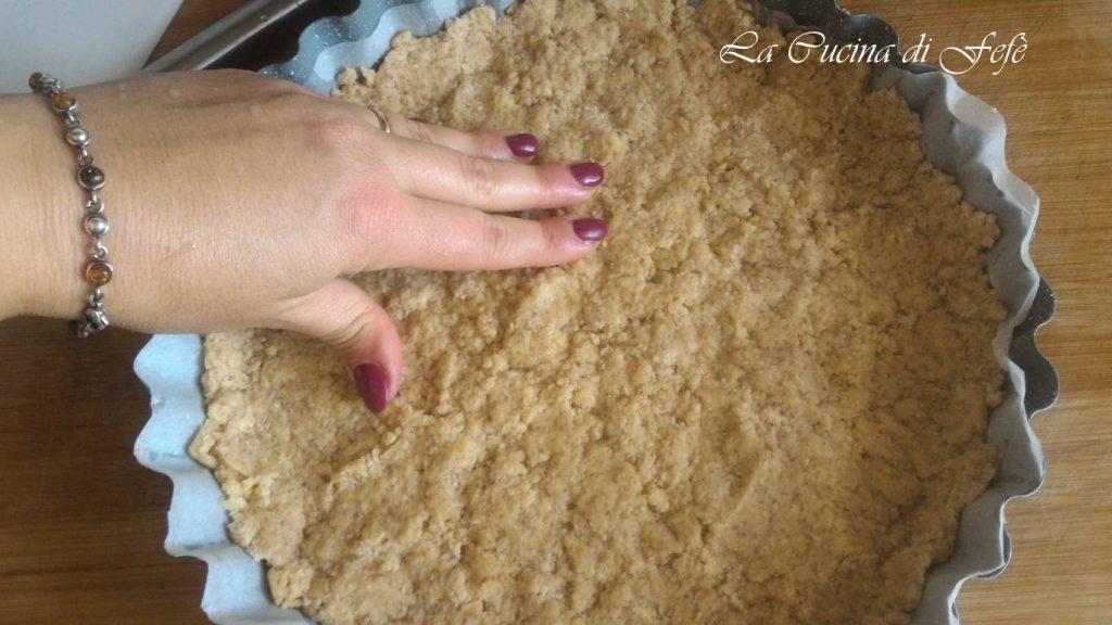 • Forrad con papel de horno el molde para tartas de Ø 22 y distribuid dentro tres cuartas partes de la masa, compactando bien con las manos sobre el fondo y los bordes.
