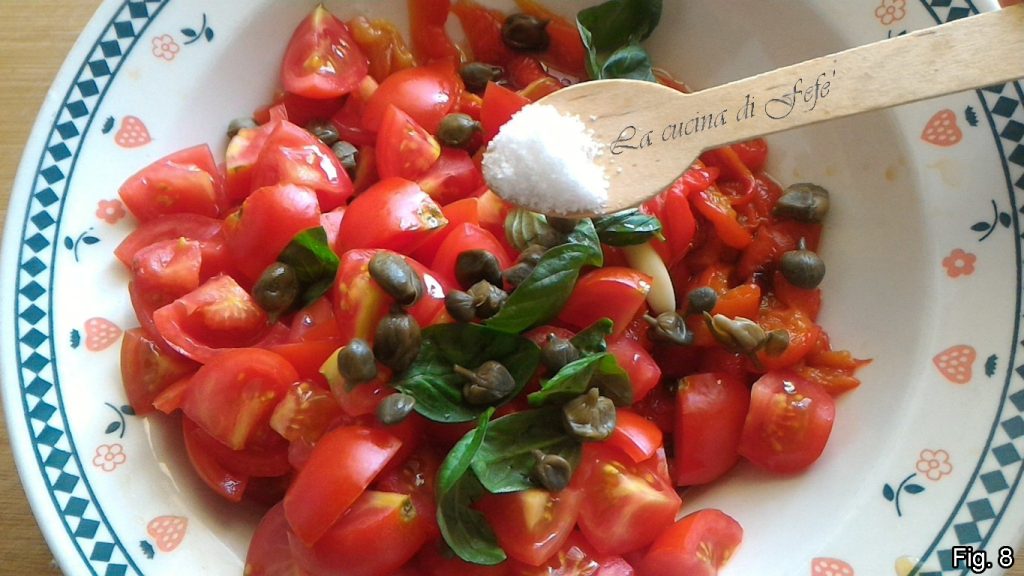 Añadid un puñado de alcaparras desaladas bajo agua corriente y bien exprimidas, los dientes de ajo, las hojas de albahaca, la sal y la guindilla (fig. 8).