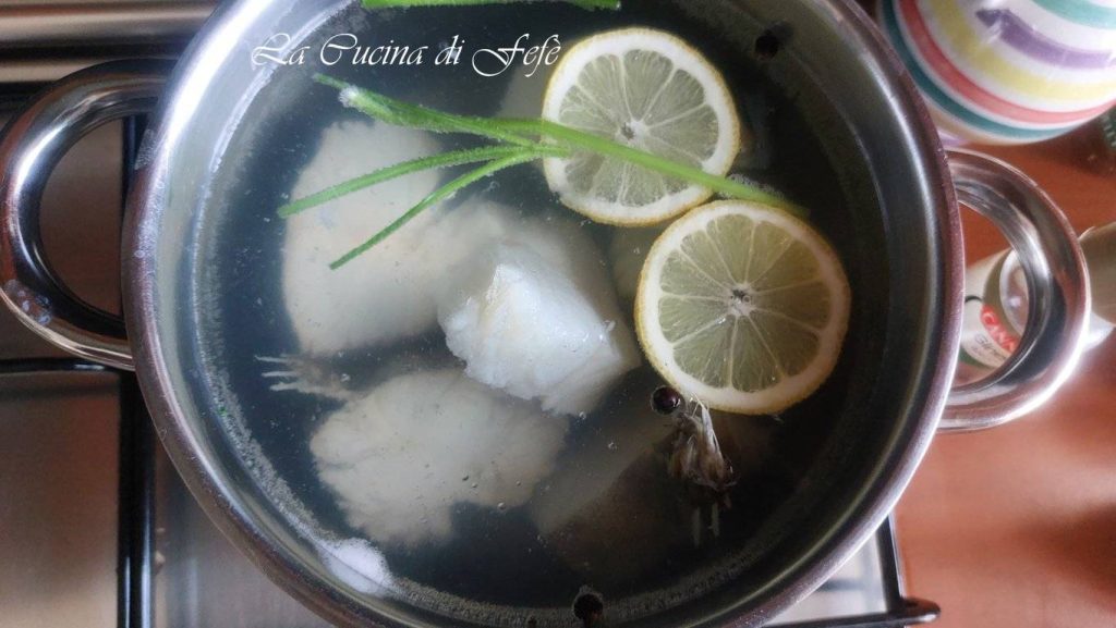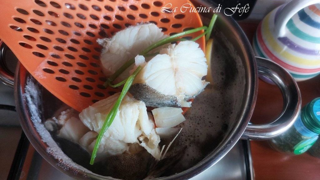 En cuanto empiece a hervir, añade los trozos de bacalao y cuece a fuego mínimo durante 10′.