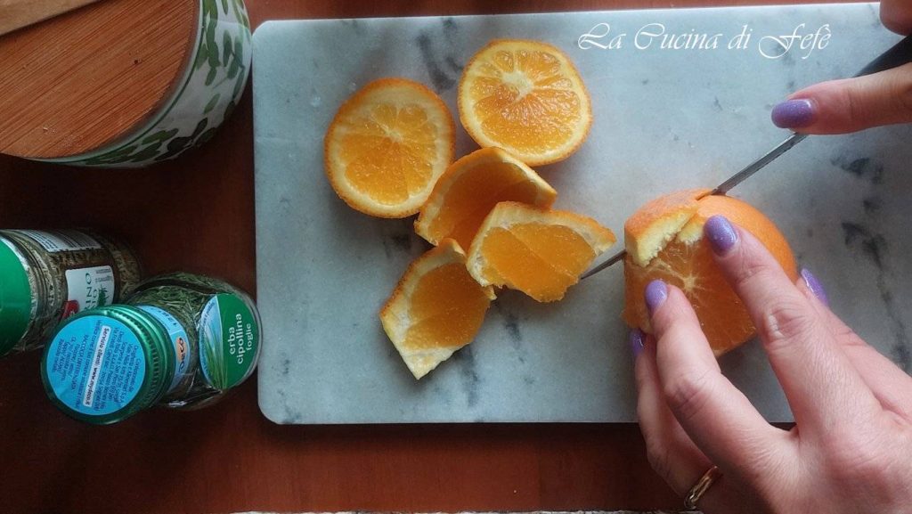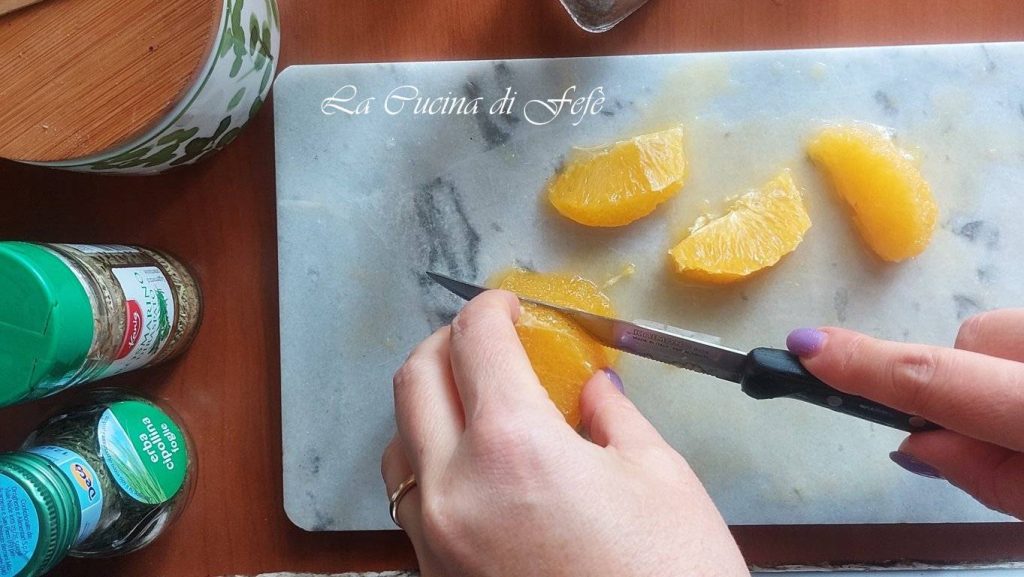 Mientras tanto, pela en vivo una gran naranja, cortando primero los dos extremos y luego la cáscara de arriba a abajo. Es importante en esta operación que también se quite la piel blanca al cortar.