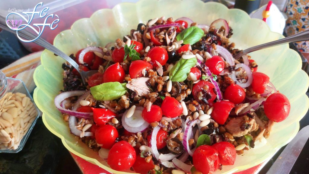 Aunque aquí en Sicilia el calor no parece disminuir, es más, estos días la alta humedad lo ha hecho aún más insoportable, ¡con esta receta cierro oficialmente la sección ensaladas de verano! Sí, porque ya estamos a mediados de septiembre y faltan solo diez días para la llegada del otoño, así que quiero compartir con vosotros esta receta fresca y deliciosa mientras las temperaturas lo permitan. Se trata de un primer plato a base de arroz rojo y cereales, una excelente alternativa a la pasta, rica en fibras, vitaminas y mucho sabor. Yo compré una mezcla ya lista, pero si no la encontráis, podéis utilizar los cereales que tengáis en la despensa o que más os gusten. El resultado es un plato colorido, aromático y saludable, fácil pero sobre todo rápido de preparar, ya que todos los ingredientes, excepto los cereales, se añaden crudos. Un plato único que se inspira en los sabores mediterráneos, enriquecido con filetes de atún rojo, en mi caso comprados en Marzamemi de una conocida empresa pesquera, tomates cherry, cebolla calabresa, alcaparras de Salina, piñones, aceitunas y mucho, mucho albahaca. Una comida simple pero estimulante, perfecta para disfrutar en la playa si todavía estáis de vacaciones, al aire libre, en el jardín, o para llevar como almuerzo al trabajo. Veréis, será vuestro comodín del verano, pero también del otoño, simplemente cambiando las verduras por otras de temporada.