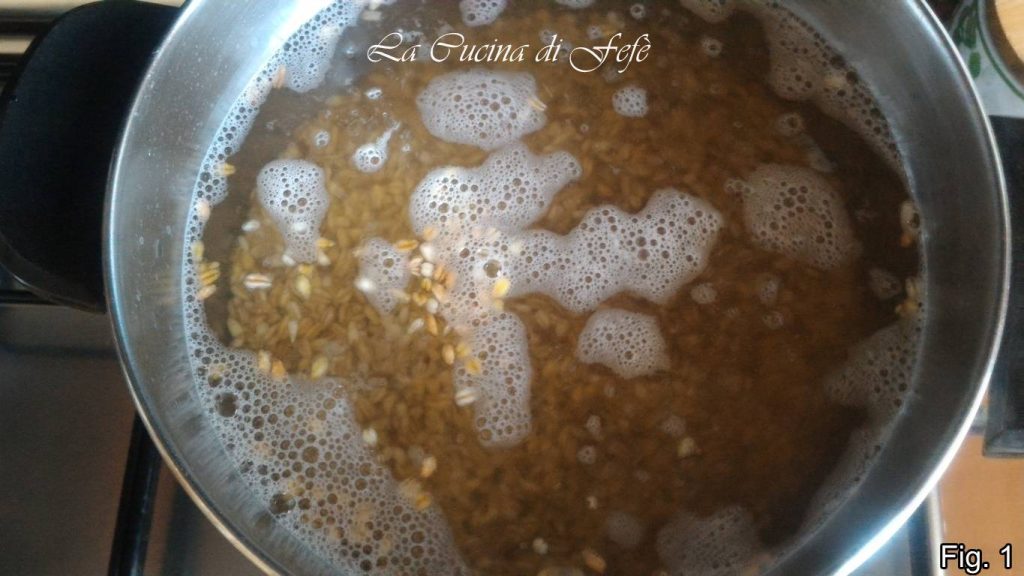 Comienza enjuagando la mezcla de cereales y arroz rojo bajo agua corriente, luego lleva a ebullición una olla llena de agua con sal, vierte los cereales con el arroz y cocina a fuego lento durante el tiempo indicado en el paquete, en mi caso 10′ (fig. 1).