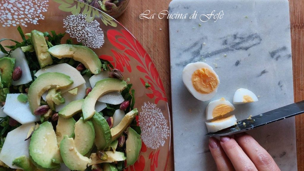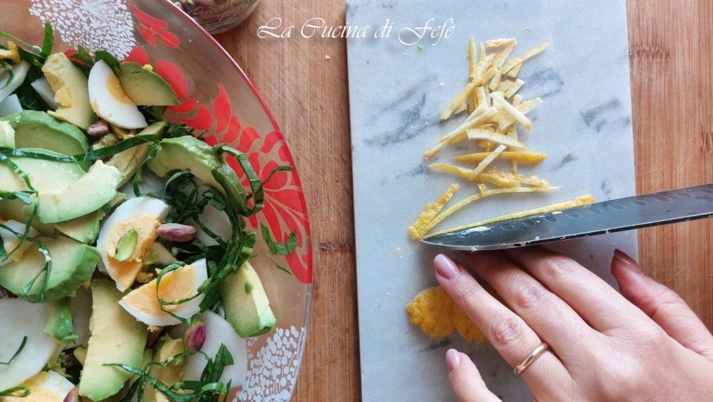 Si eres siciliano y vives en el hinterland de Aci, conocerás la col trunzu de Aci, una col rizada cultivada precisamente a lo largo de todo el promontorio de la Timpa, cerca de la localidad de Acireale y zonas circundantes. La reserva está caracterizada por terrenos de origen volcánico, lo que da origen a muchos vegetales autóctonos como este, rico por tal motivo en minerales y vitaminas. Gracias a estas cualidades, se ha convertido en un presidio Slow Food, involucrando a un pequeño grupo de productores que siguen reglas de cultivo sostenibles. Así que, si te lo encuentras en algún puesto de frutas y verduras, te invito a comprarlo y utilizarlo en la cocina para muchas preparaciones. Su versatilidad es máxima, ya que cada parte es comestible, incluidas las hojas, y puedes disfrutarlo incluso crudo como en esta vieja receta campesina que comparto gustosamente contigo. ¡Una ensalada que mi abuela preparaba a menudo con la col rizada cortada en juliana y sazonada simplemente con aceite, sal y vinagre o, en lugar de este último, el zumo de limón. Puede ser consumido como guarnición o como plato único, agregando en mi versión huevos cocidos, pistachos de Bronte, zeste de cidra y rodajas de aguacate. Me gustaría resaltar que se trata de una reinterpretación moderna que se adapta a nuevas combinaciones, pero que creo que te gustará. ¡El resultado es sublime!