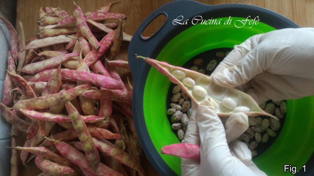 Empieza con la operación más tediosa, pero en suma bastante rápida, que es sacar las judías una por una de sus vainas y reunirlas en un colador y enjuagarlas bien (fig. 1).