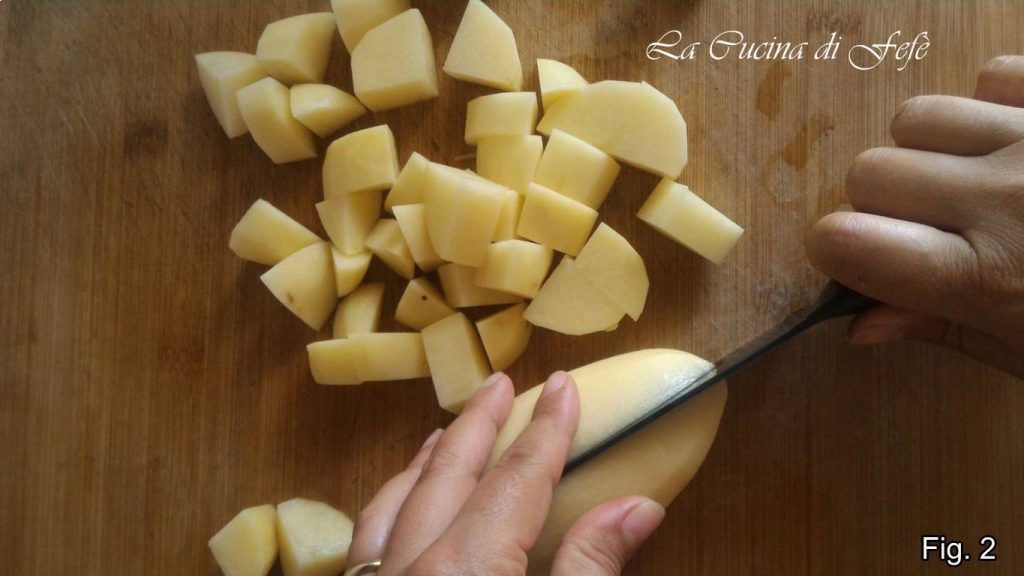 Ocúpate también de las patatas, lavándolas, pelándolas y cortándolas en trozos (fig. 2), y de las otras verduras, la lechuga cortada en tiras, los tomatitos a la mitad y la cebolla en rodajas (fig. 3).