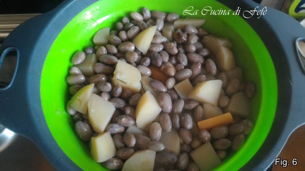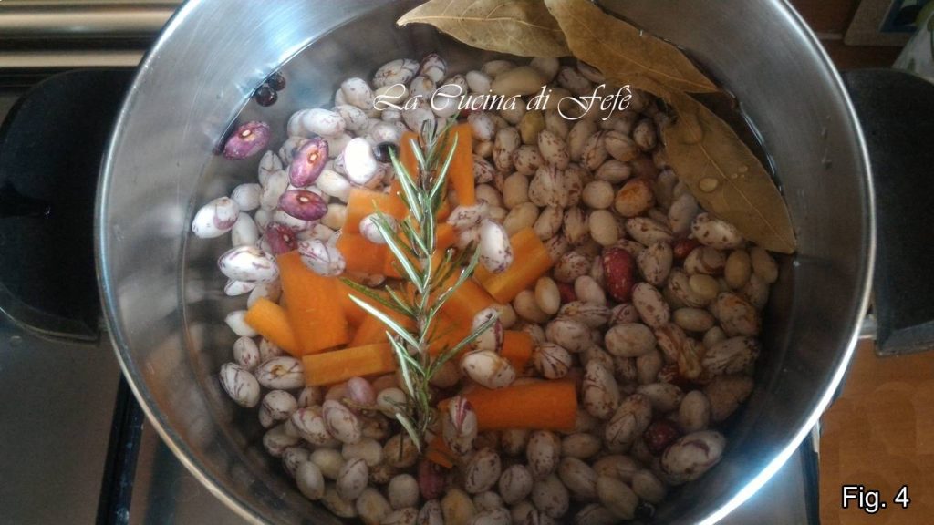 En una cacerola de fondo grueso, mejor aún si es de barro, transfiere las judías desgranadas junto a una zanahoria cortada en trozos, las hierbas aromáticas, las bayas de enebro y las hojas de laurel. Cubre enteramente con agua fría sin salar* y lleva a ebullición (fig. 4). Luego baja el fuego al mínimo y cocina con la tapa durante 10′. Pasado este tiempo, agrega también las patatas y prosigue la cocción por otros 20′, mezclando de vez en cuando y añadiendo un poco más de agua, esta vez caliente, si es necesario (fig. 5).