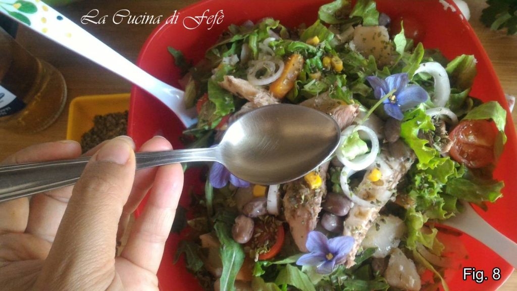 Añade también el maíz, los filetes de caballa picante bien escurridos y condimenta con una pizca de orégano seco, un buen chorro de aceite, un chorrito de zumo de limón y el vinagre de manzana. Ajusta de sal y pimienta si te gusta (fig. 8).