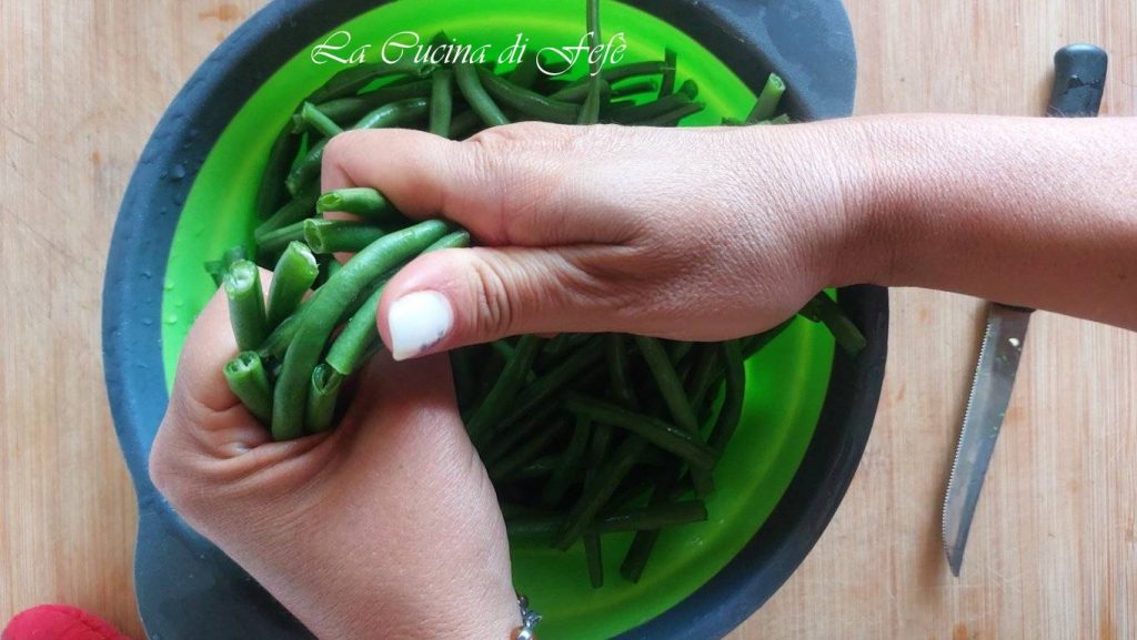 Mientras tanto, cuece las judías verdes en agua hirviendo ligeramente salada durante 10′ desde que empieza a hervir. Deben quedar crujientes.
