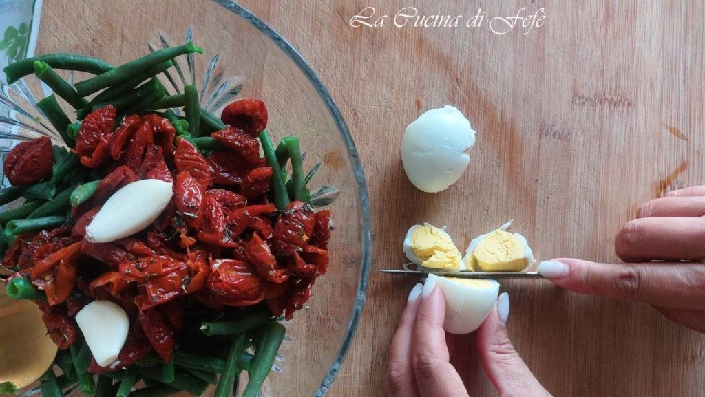Una vez cocidos, escurre bien las judías verdes con la ayuda de una espumadera y transfiérelas a una ensaladera grande junto con los tomates cherry secos previamente escaldados en agua caliente durante 2′ después de haberlos escurrido bien y secado con papel absorbente. Condimenta con orégano seco, los dientes de ajo y una pizca de pimienta.