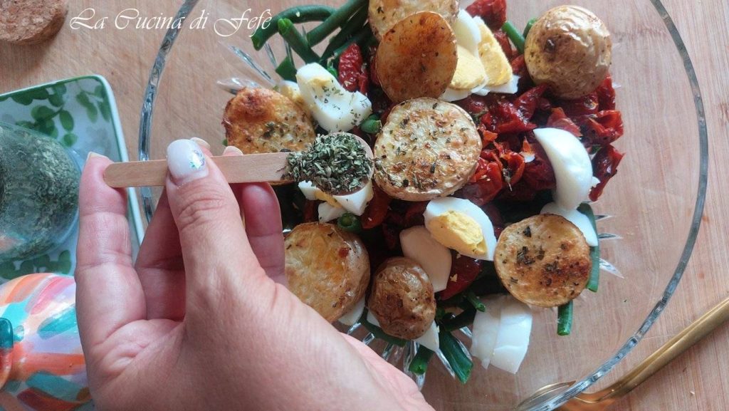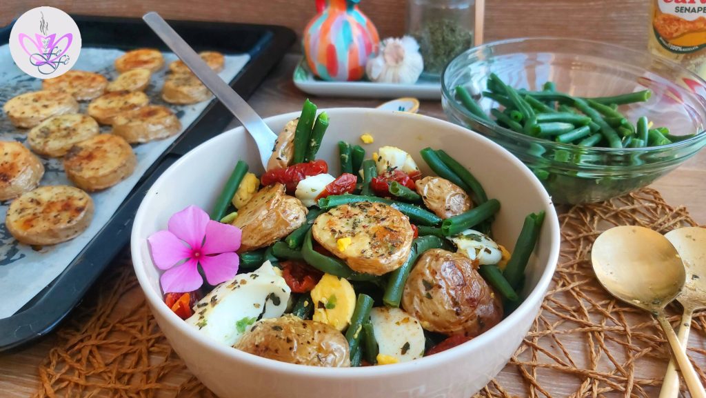 Preparar y consumir frecuentemente platos frescos y nutritivos es siempre una excelente solución para combatir el calor y refrescarse durante los días de verano. Entre las muchas ensaladas frías experimentadas en estos años, esta a base de judías verdes, tomates cherry secos, huevos duros y patatas al horno no solo es una de las más sabrosas, sino también de las más ligeras y saludables. Perfecta para quien quiera darse un comida ligera, tal vez para llevar a la oficina o a la playa, para disfrutar bajo la sombrilla. Gracias a la adición de las patatas no hervidas como se hace habitualmente, sino cocidas al horno con un condimento especial, ¡el resultado final será realmente delicioso e irresistible! Un plato único al estilo vegetariano y super versátil, que se puede enriquecer o variar aún más según tus gustos y necesidades alimentarias.