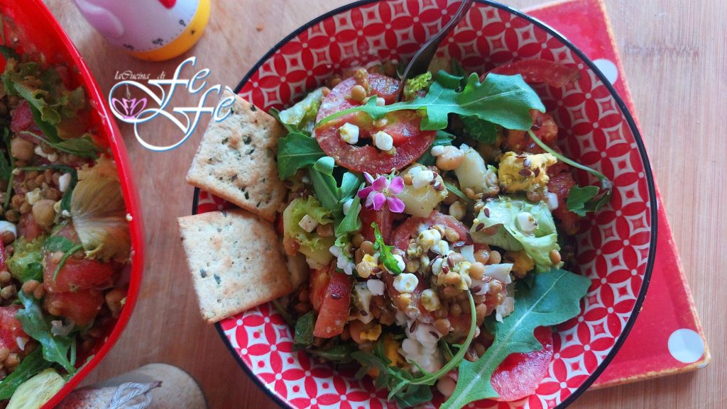 ¡Verano para mí es sinónimo de platos frescos, rápidos y ligeros! No me gusta pasar demasiado tiempo en la cocina, prefiero pasar mi tiempo al aire libre, en la playa, viajando y comiendo comidas menos calóricas y más frugales. ¡Esta ensalada refleja precisamente estas características, es más, la definiría más como un plato único que como una guarnición, considerando que en su interior encontrarás todas las valiosas proteínas vegetales de las legumbres, en este caso garbanzos y lentejas. Se prepara todo rápidamente, si compras las legumbres ya cocidas, solo tendrás que ensamblar los ingredientes en una ensaladera y condimentarlos. Te digo, ¡demasiado buena! Para quienes desean consumir una comida ligera pero nutricionalmente completa, aquí están incluidas todas las propiedades beneficiosas de un plato de estilo vegetariano, ¡con un alto poder energético! La elección del condimento aquí es esencial, de hecho, el aceite de oliva virgen extra al limón que utilicé, a diferencia de otros aceites aromatizados disponibles en el mercado, ha sido elaborado con «auténticos» cítricos, prensados junto con las aceitunas. Un gran orgullo siciliano que comparto y doy a conocer con gusto, capaz de realzar todos los ingredientes presentes y dar un toque de increíble frescura a cada bocado.