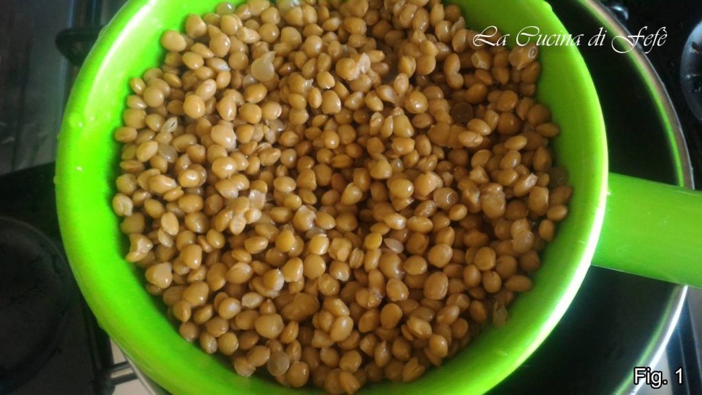 Comienza enjuagando las legumbres bajo agua corriente, eliminando su líquido de conservación, usando un colador y reserva (fig. 1).