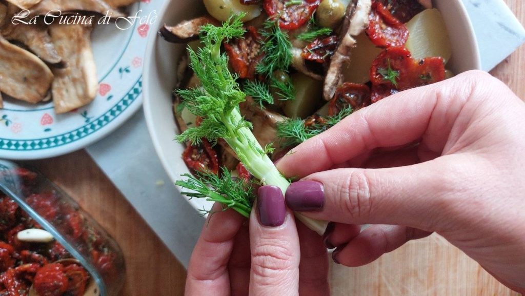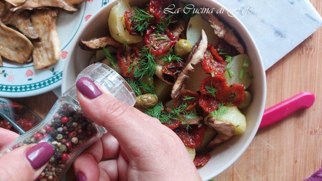• Mientras las patatas se enfrían, en un bol condimenta los tomates secos, previamente escurridos y secados con papel absorbente de cocina, añadiendo orégano y aceitunas verdes.