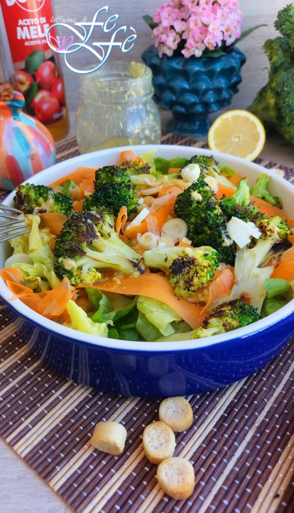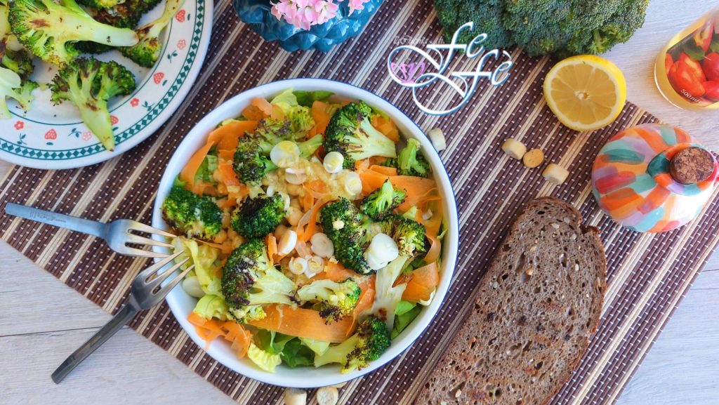 Como sabéis, estoy en constante búsqueda de recetas que sean sabrosas, nutritivas y ligeras al mismo tiempo. Mi misión es comer sano sin demasiadas renuncias y respetar siempre la estacionalidad de los ingredientes. Obviamente, otro de mis buenos propósitos es no dejar caducar la comida que compro y crear nuevos platos, aprovechando en la medida de lo posible también las sobras. Con esta ensalada de brócoli, garbanzos y iceberg, creo que he dado en el blanco. Sirve para recordarnos que incluso en invierno se pueden disfrutar las verduras en ensalada, ya que consumirlas crudas aporta beneficios a nuestro organismo. De hecho, esta ensalada tiene muchas cualidades, siendo la primera de ellas que es rica en proteínas vegetales, gracias a la presencia de los garbanzos, y además es vegana y sin gluten. Otra ventaja es ciertamente la simplicidad y rapidez de ejecución, ideal para aquellos que tienen poco tiempo para dedicar a la preparación del almuerzo o de la cena. Además, es tan versátil que podemos personalizarla con lo que tengamos en la despensa o en el frigorífico, como lo he hecho yo, y considerarla tanto como un sencillo acompañamiento como plato único. De hecho, la combinación de legumbres y hortalizas de temporada como el brócoli, que ya sabéis, son fuente de vitaminas, sales minerales y propiedades antioxidantes, da lugar a un plato ligero, sustancioso, energético y saciante. Será la perfecta fiambrera para llevar al trabajo o para disfrutar durante una excursión o como un plato frugal para quien desea mantenerse en forma sin renunciar al sabor.