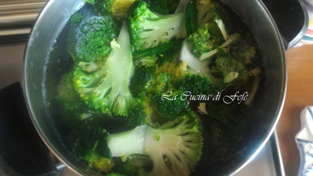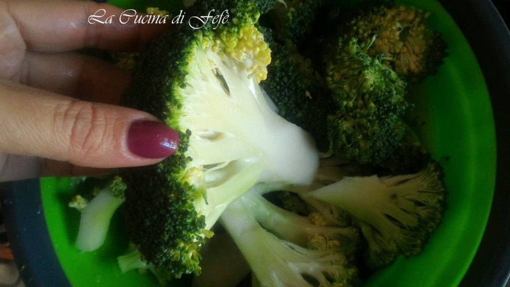 Limpia los brócolis, eliminando las partes menos nobles como tallos y hojas que podrás usar para otras preparaciones, luego divídelos en ramilletes grandes, cortándolos en rebanadas. Enjuágalos abundantemente bajo el agua corriente.