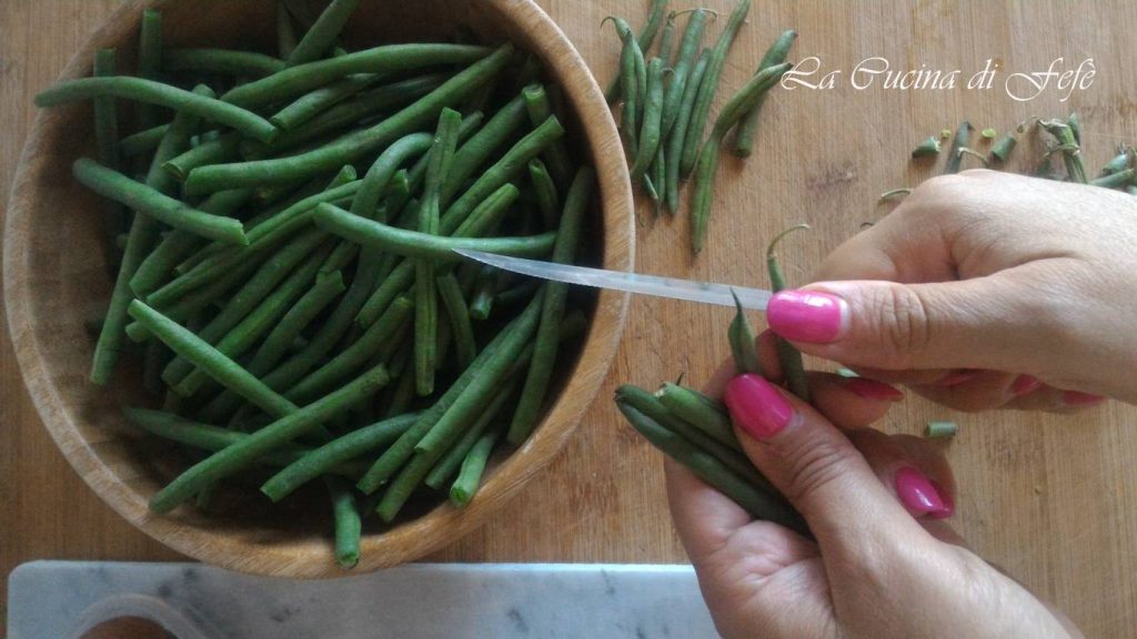 Lavad, pelad y cortad las patatas en cubitos. Cocedlas al vapor junto con las judías verdes o, alternativamente, hervidlas en abundante agua sin sal durante unos 15 minutos a partir de la ebullición, pero os aconsejo insertar los dientes de un tenedor para evaluar el grado de cocción que prefiráis. En cualquier caso, no deben estar demasiado cocidas, sino más bien una cocción al dente.