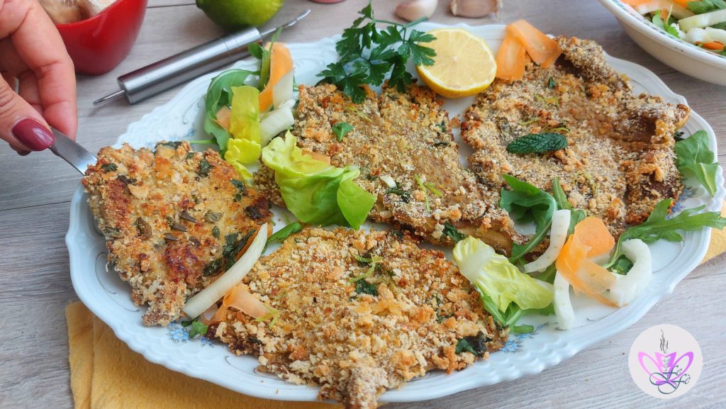 Hace unos días, encontré en el mercado local cerca de casa una cantidad increíble de setas Pleurotus, bonitas, grandes y carnosas, ¡una tentación a la que no pude resistirme! Este tipo de setas, como los champiñones, son mucho más económicas y versátiles que sus hermanos Porcini, ¡sin contar su deliciosidad, especialmente si se preparan en filetes! Sí, lo has oído bien, el tamaño de su sombrero, de hecho, hace que estas setas sean perfectas visualmente para esta receta, convirtiéndolas en una alternativa válida y deliciosa a la carne dentro de una dieta vegetariana! Preparar los filetes de setas, además, es un juego de niños y en poco tiempo llevarás a la mesa un segundo plato que podrás acompañar con cualquier guarnición que desees o un finger food dentro de un aperitivo! ¡Pocos ingredientes y el secreto para un empanado súper crujiente, harán de este plato un éxito en cada ocasión! Podrás decidir si freír las setas sumergiéndolas en aceite caliente o cocinarlas al horno, como hice yo, para una versión más ligera y digerible! Sencillas, súper crujientes y deliciosas, ¡desaparecerán en un instante!