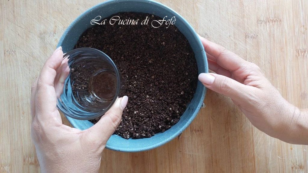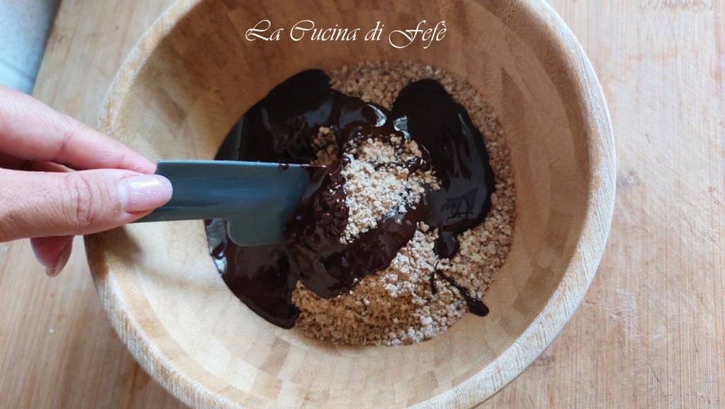 Forra el fondo de un molde desmontable de diámetro 20 Ø con papel de horno y engrasa los bordes. Luego distribuye en la base la mezcla de cereales y chocolate, compactándola con un vaso y tratando de nivelar para obtener el mismo grosor en todo el diámetro. Mete en el refrigerador por 30′.