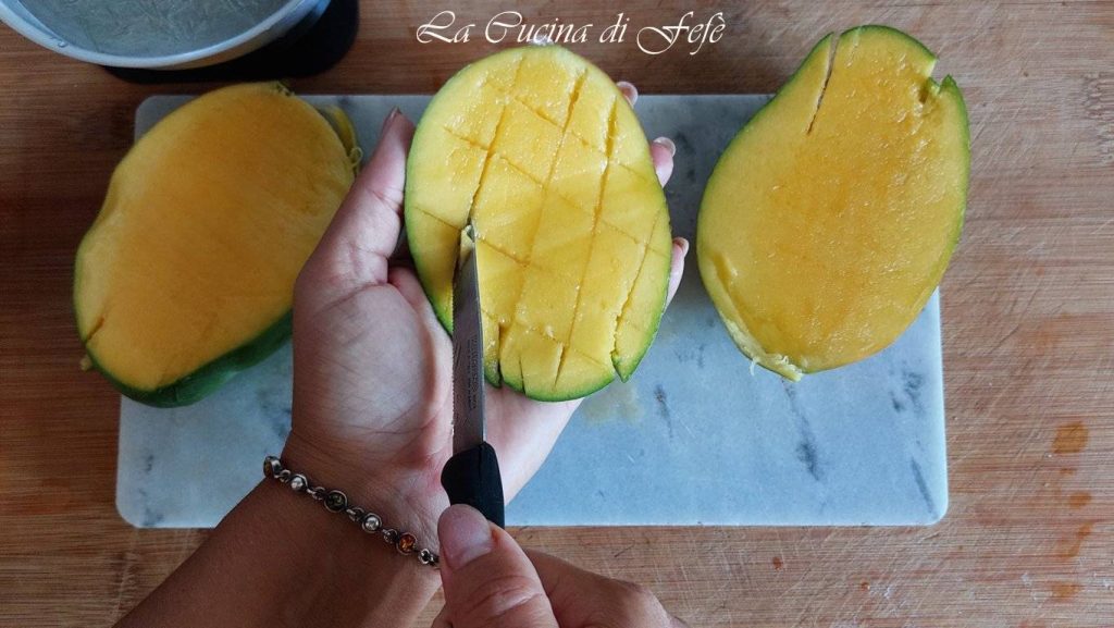 Mientras tanto, lava y corta el mango en forma de erizo sin pelarlo previamente. Una vez que hayas obtenido las dos mitades sin hueso, haz cortes oblicuos cruzados en ellas, sin tocar la piel.