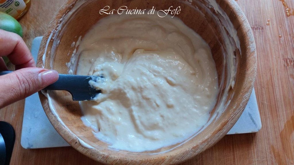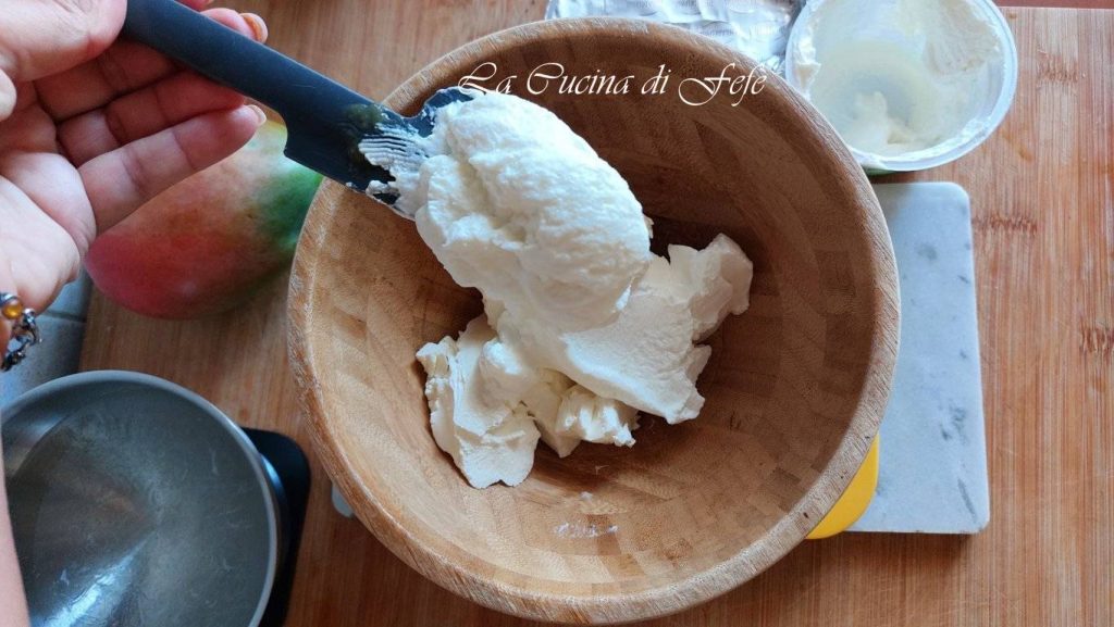 Vierte la leche dentro de la crema de queso y mango y mezcla una última vez.