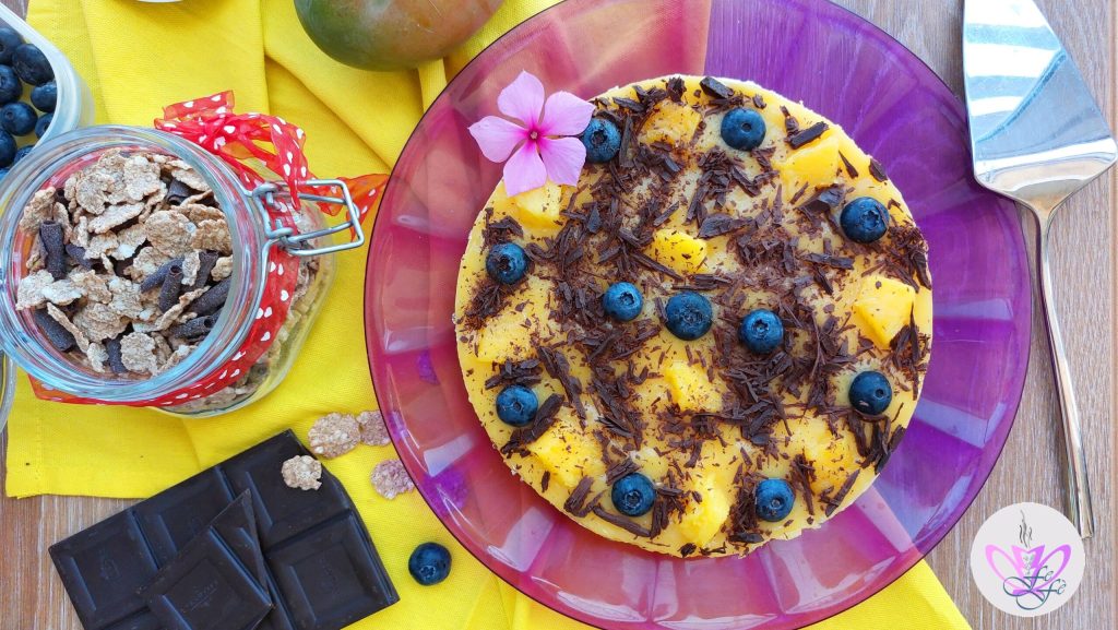 ¿Alguna vez te has sentido un poco apagado y quieres obtener la máxima energía de la alimentación para afrontar el estrés de la rutina diaria? En estos casos, necesito una carga de azúcares, ya que soy golosa, busco en los dulces mi necesidad de restablecer el equilibrio, pero no siempre es posible. Me convertiría rápidamente en un globo aerostático si cada vez que deseo reaccionar ante el frenético ritmo de la vida consumiera delicias cremosas y altas en calorías (¡aunque me encantan)! En este caso, se puede encontrar un compromiso justo con algunos dulces fit preparados con ingredientes saludables y ligeros para mimarse un poco sin perder la forma. Mi cheesecake de mango nació precisamente de esta necesidad, por lo tanto, es decididamente más ligera, ¡pero debo decir que fue un éxito incluso para mi marido que no puede abusar demasiado de grasas y azúcares simples! De hecho, su base no lleva ni galletas, ni mantequilla ni nata, sino simples cereales de cacao mezclados con chocolate negro al 85%. ¿Sabías que el chocolate con mayor contenido de cacao es uno de los alimentos más ricos en antioxidantes? Además, contiene flavonoides que garantizan actividad antiinflamatoria, reguladora de la presión arterial y de la sensibilidad a la insulina, sin mencionar la presencia del triptófano, aliado de nuestro buen humor. Dicho esto, la crema de este cheesecake está hecha de yogur griego y queso para untar. Por lo demás, solo mango triturado. Entonces, ¿te he convencido?