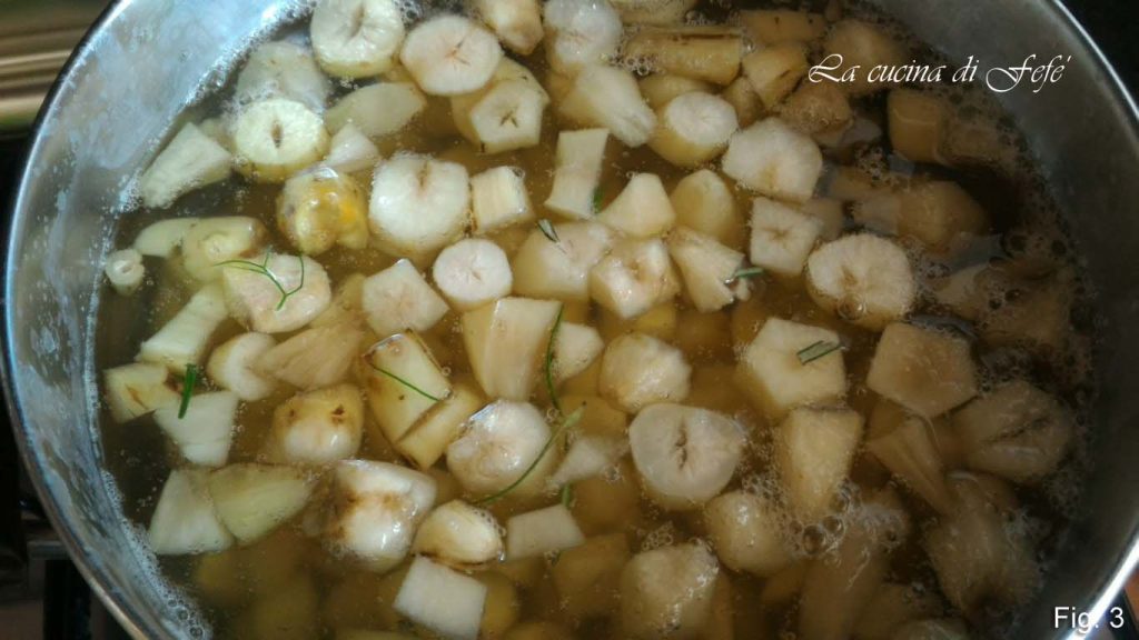 Cuécelos a fuego lento en una olla con abundante agua ligeramente salada y sin tapar durante unos 15’/18′. Yo añadí romero deshojado, pero es completamente opcional (fig. 3).