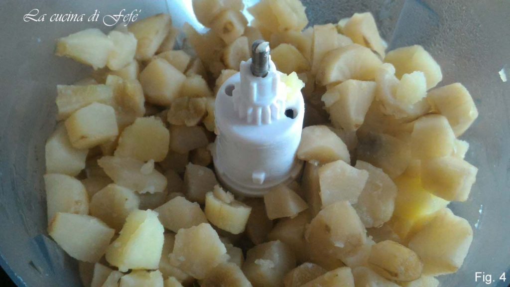 Escúrrelos en cuanto estén tiernos. En estos casos bastará con clavar los dientes de un tenedor para comprobar el grado de cocción. Déjalos templar unos minutos y transfiérelos al recipiente de una batidora o robot de cocina (fig. 4).