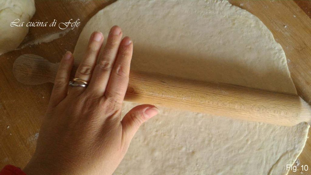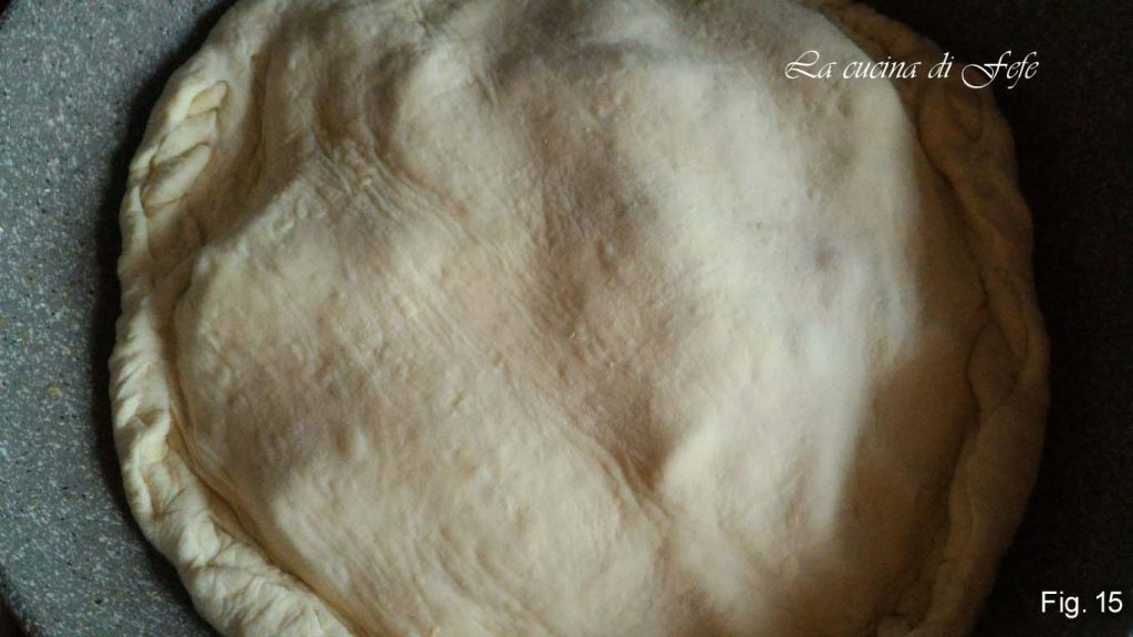 Comprobad bien la cocción de la focaccia, tan pronto como aparezca dorada, giradla, ayudándoos con la misma tapa, es decir, dejándola deslizar sobre ella y luego volteándola (fig. 16).