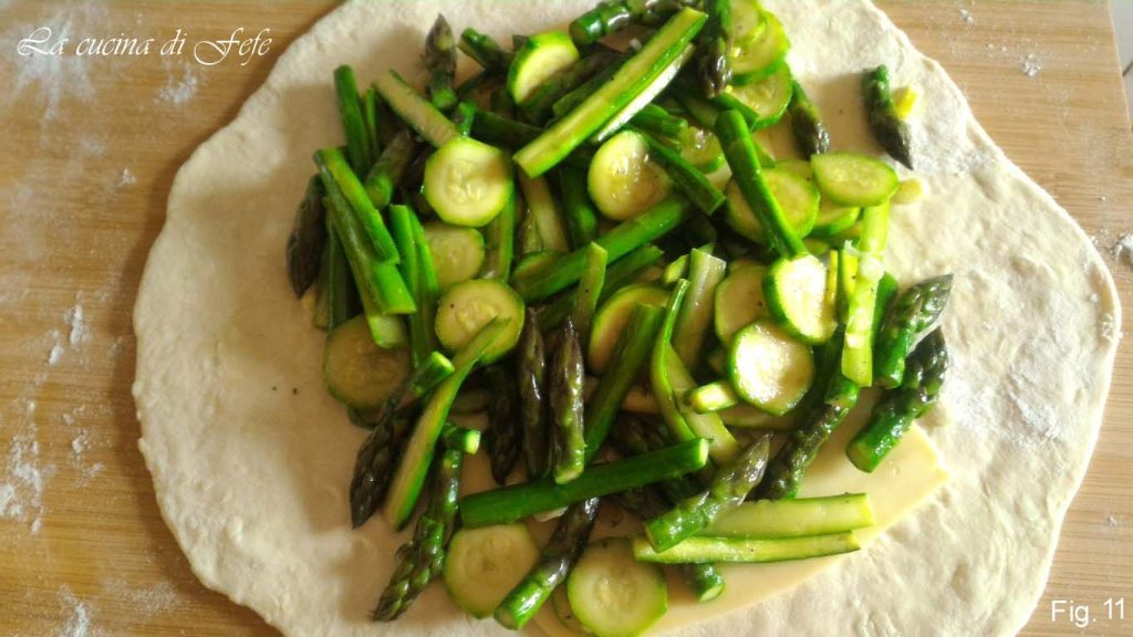 Dejad reposar el panecillo durante unos 15′ a temperatura ambiente cubierto con su mismo cuenco de trabajo. Mientras tanto, lavad y limpiad los calabacines y los espárragos, cortad los extremos de los primeros y eliminad la parte más dura del tallo de los segundos y peladlos.