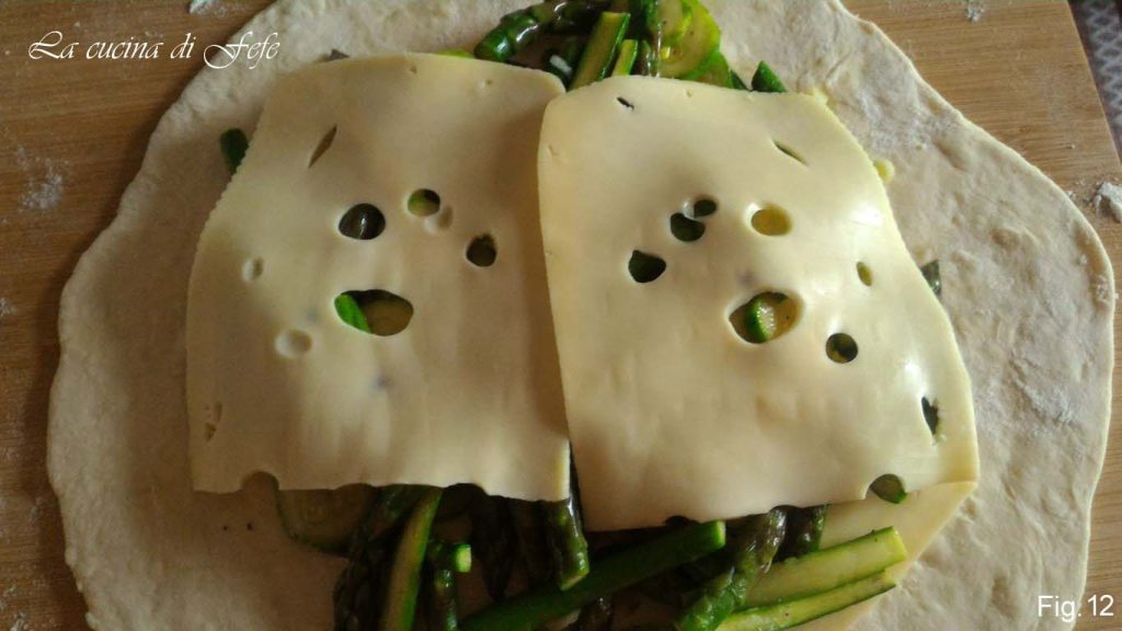 Tomad una de las dos bases, ponedla sobre una hoja de papel de horno ligeramente enharinada y rellenadla con 2 rodajas de emmenthal, luego añadid las verduras salteadas en sartén.