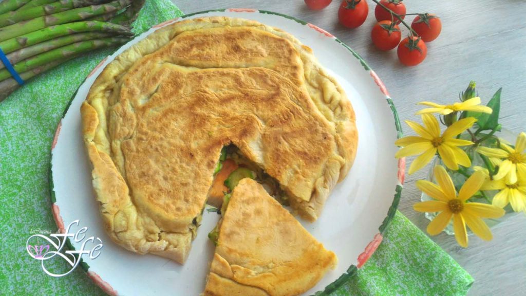 Si nunca habéis probado la focaccia en sartén, os doy un consejo para una receta realmente fácil y de gran resultado final! Esta focaccia es increíble, porque se prepara de manera exprés, el tiempo de amasarla y cocinarla en el fogón, sin tiempos de levadura! Solo será necesario añadir bicarbonato ¡y listo! Ahora que los días se hacen más cálidos y no os apetece encender el horno, olvidaros de las bandejas y preparad vuestra focaccia solo con una sartén antiadherente y una tapa. ¿Alguna vez os ha pasado que no tenéis ganas de pasar mucho tiempo cocinando pero aún así tenéis que preparar algún tipo de cena? Pues esta es la receta que os conviene. Y vuestros niños la adorarán, creedme. El relleno a base de vegetales primaverales como calabacines y espárragos, y la adición de rodajas de queso fundente, ¡es algo superlativo! Será perfecta para una cena rápida o un aperitivo informal con amigos. Obviamente, esta es mi propuesta personal, pero podréis variar todas las veces con las verduras que prefiráis, gracias a la super versatilidad de esta receta. ¡Bocado tras bocado, será una explosión de sabores increíbles!