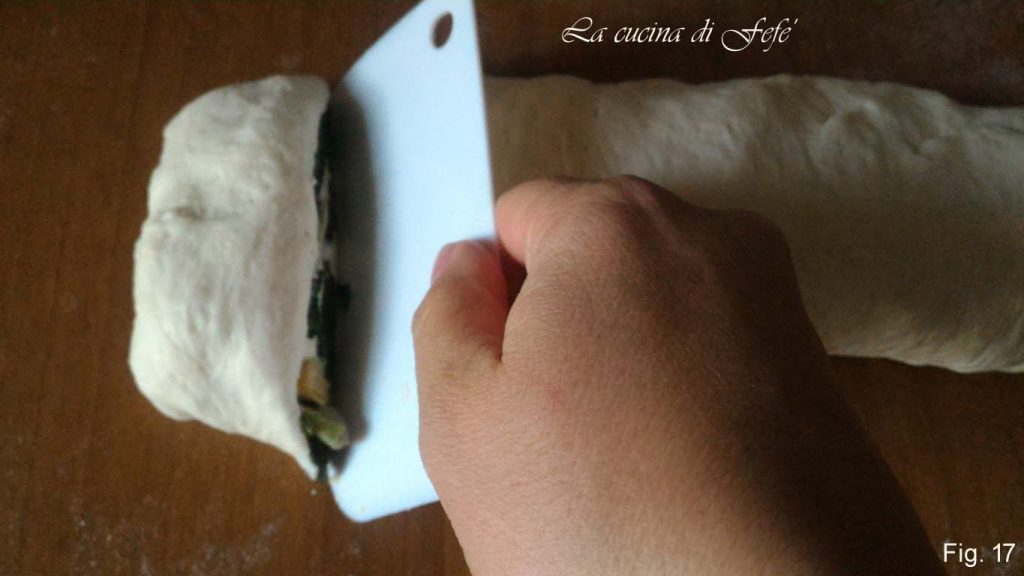 Enrollad la masa por el lado más largo, hasta formar un cilindro (fig. 16).