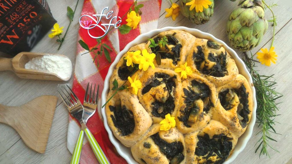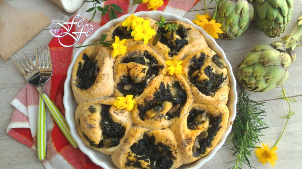 Para seguir con el tema de la primavera, últimamente me estoy dedicando a preparaciones adecuadas para las clásicas excursiones de un día, aquellas que solían hacerse con la llegada de los primeros cálidos rayos de sol. ¡Este año también nos toca quedarnos en casa, pero nunca hay que desanimarse! ¡Siempre podemos mejorar esta situación organizando un pequeño aperitivo en el jardín, un picnic en nuestro propio césped o, en ausencia de uno u otro, recurrir al balcón! En mi caso con vista al mar, equipado con mesa y sillas para disfrutar de los bonitos días y quizás almorzar de manera alternativa. La focaccia que hoy os propongo, hecha con espinacas frescas y las últimas reservas de alcachofas, ¡se postula para esta posibilidad! ¡Tenéis que probarla! Es esponjosísima y deliciosa, gracias también a la cremosidad de un queso fresco como la robiola, de sabor intenso y agradable. Todo bien enrollado y dividido en porciones para disponer en una bandeja y dejar levar como un pastel. Me perdonaréis si no he logrado fotografiar el interior, pero al haberlo hecho tarde, la luz de la tarde no fue capaz de resaltar suficientemente su bondad. Al menos podría haber fotografiado las sobras al día siguiente con la luz adecuada, si no fuera porque a la mañana siguiente ¡simplemente no llegó! ¡Fue completamente devorada! Así que estoy feliz de haber podido al menos inmortalizar el momento en el que fue sacada del horno aún caliente y fragante, de lo contrario podría solo haberos dejado imaginarla!