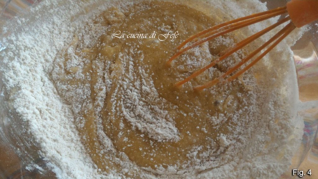 Entonces, poco a poco, añade la harina previamente tamizada con la levadura, trabajando primero con un batidor (fig. 4).