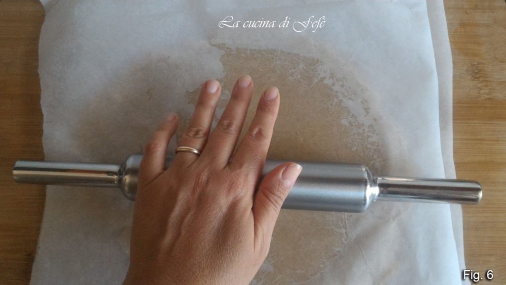 Cuando la masa se haya compactado, déjala reposar envuelta en film transparente por unos 15′, luego extiéndela entre dos hojas de papel de horno ligeramente enharinadas a un grosor de 5 mm (fig. 6).