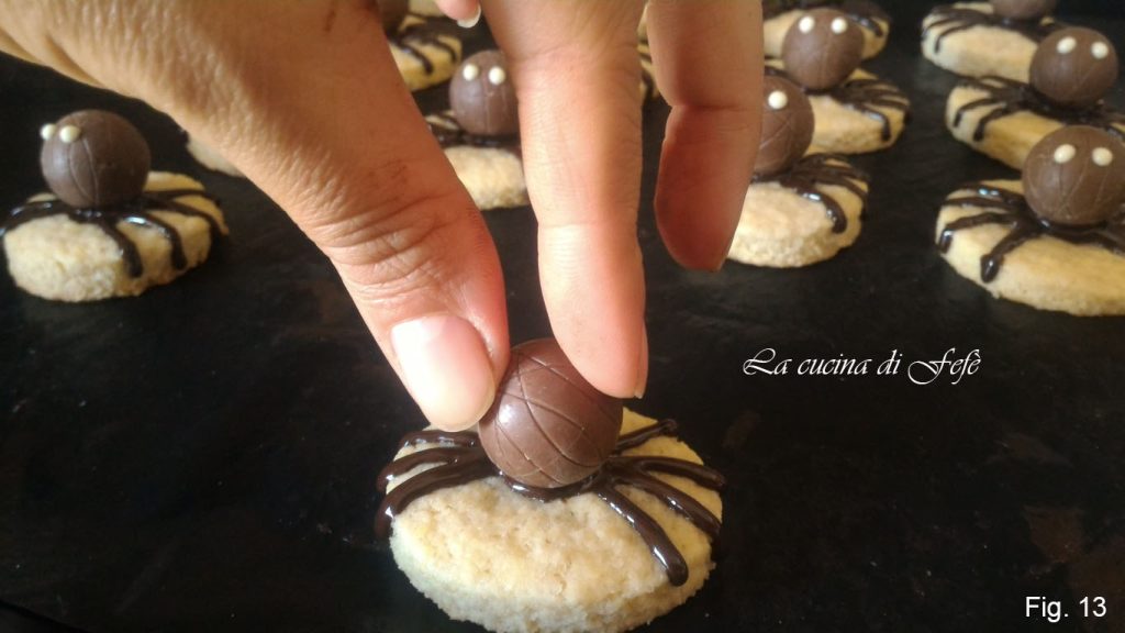 Completa creando con un puntito de chocolate negro las pupilas y deja secar bien todas las galletas arañita por al menos 1 h (fig. 15).