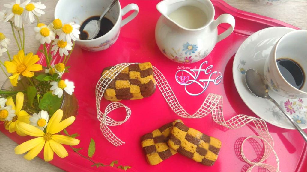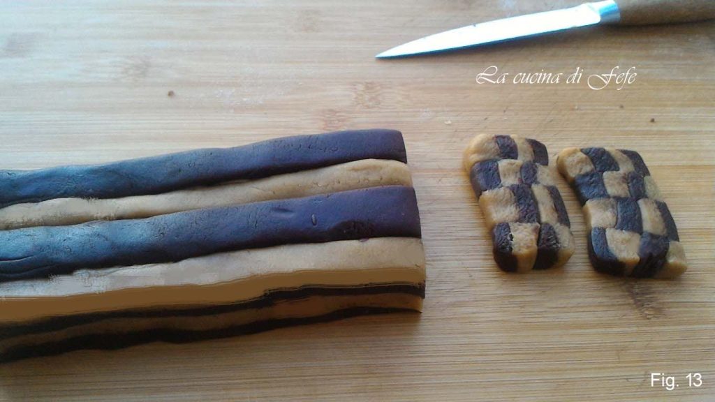 Dada la particularidad del procedimiento, fotografiar cada paso es fundamental para entender cómo componer los rectángulos de masa de vainilla y cacao. En la receta te dejo por tanto todos los pasos fotográficos para no equivocarte en la estratificación y obtener así una geometría perfecta. Extendiendo la masa más o menos ancha, podrás dar rienda suelta a tu creatividad, creando patrones a cuadros incluso más densos y jugar con el efecto visual final.