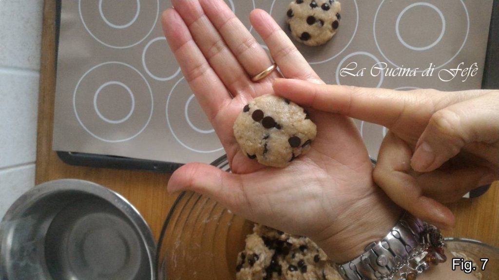 Con las manos ligeramente engrasadas, coger porciones pequeñas de la masa y hacer bolitas un poco más grandes que una nuez, aplastándolas (fig. 7).