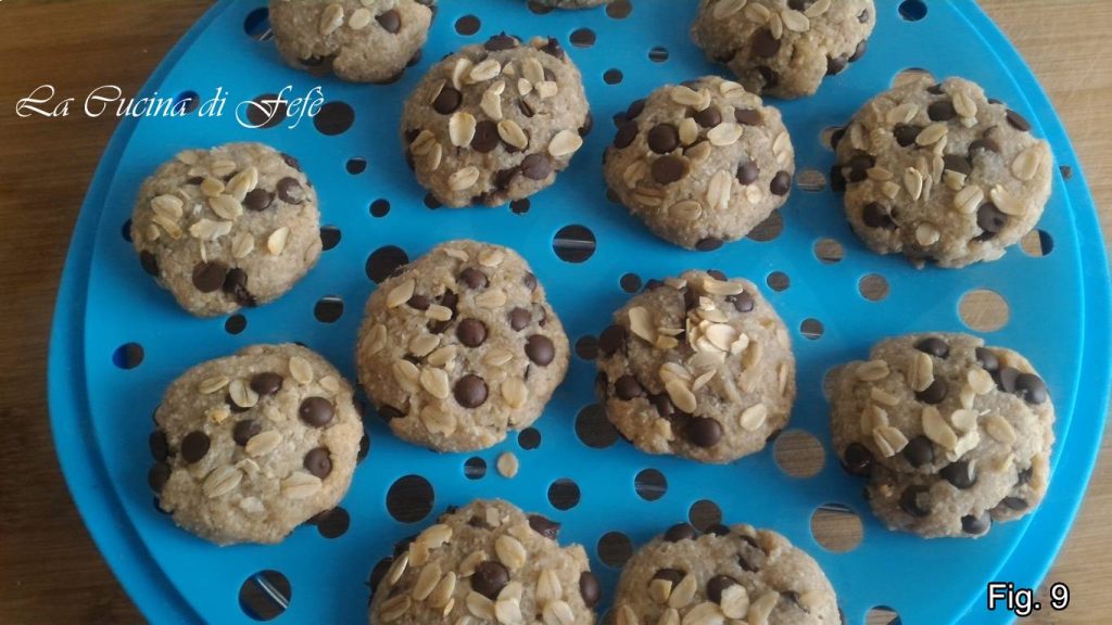 Colocar las galletas en una bandeja para hornear forrada con papel de horno y decorar la superficie con un puñado de copos de avena, presionando ligeramente (fig. 8).