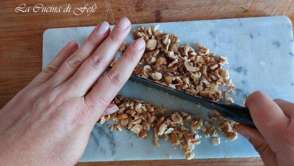 Ahora dedica tiempo a la mezcla de nueces y avellanas. También estas se deben picar con el cuchillo finamente*, y reserva.