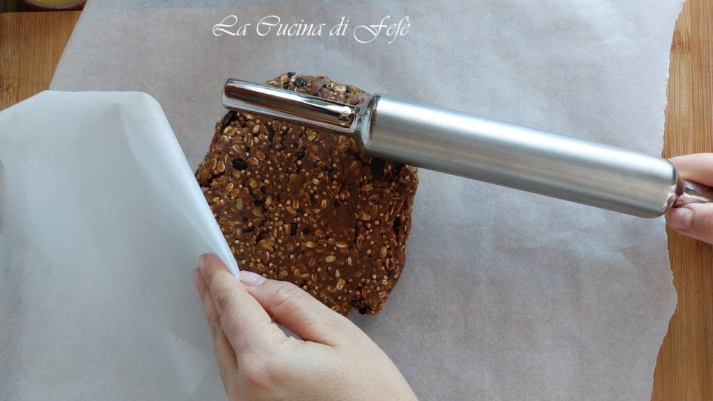 En este punto, traslada la masa a la superficie de trabajo y colócala entre dos hojas de papel de horno.