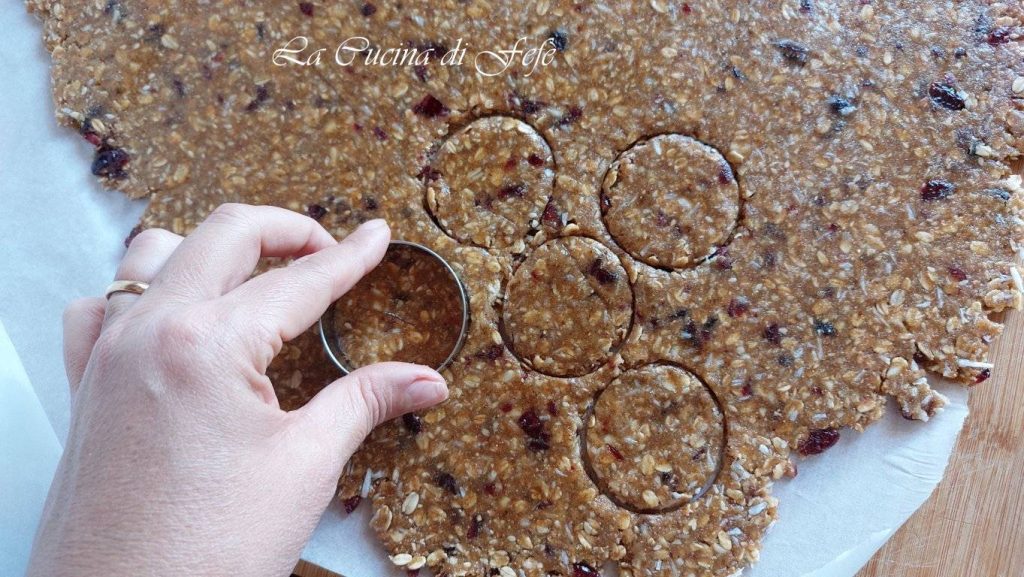 🟣*Picar finamente la fruta deshidratada y los frutos secos: es una elección recomendada para poder estirar la mezcla de forma homogénea y cortar las galletas con mayor facilidad.