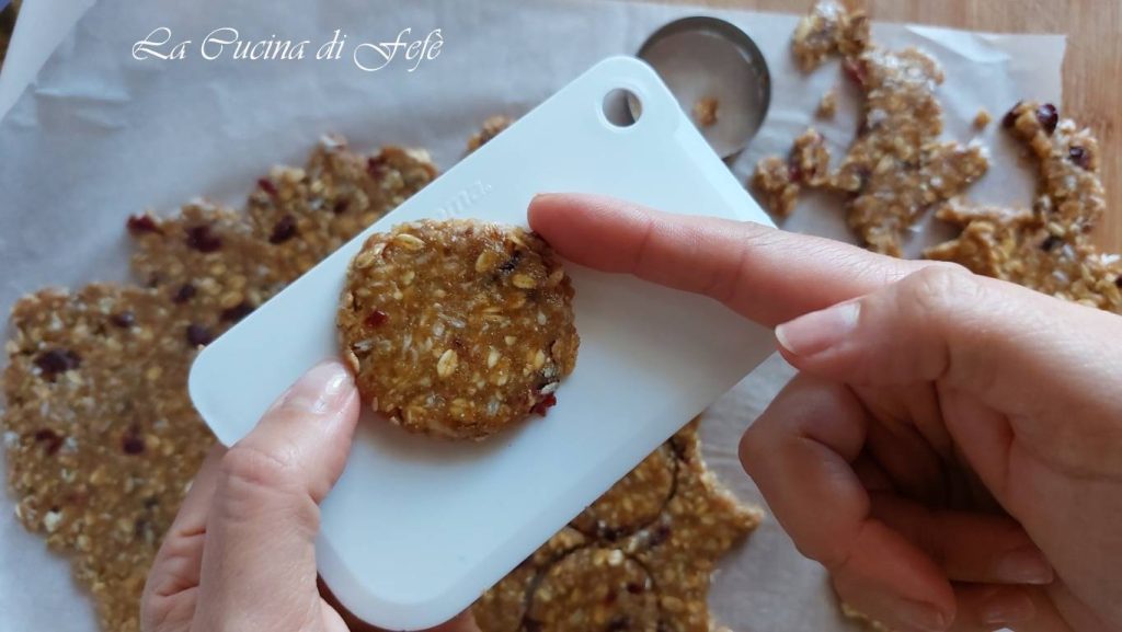 • Retira la primera hoja de papel de horno y, ayudándote con un cortapastas de Ø 5 cm, corta las galletas.