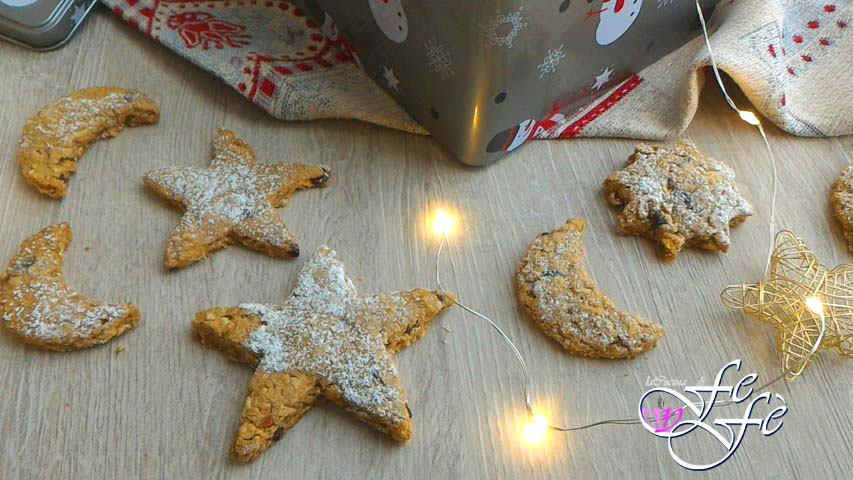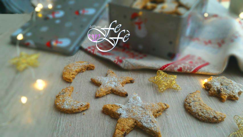 Sí, ya lo sé, las fiestas ya han pasado, pero no podía dejar de compartir con vosotros mi mágico «cielo estrellado»! Estrellas y lunas luminosas en la noche, donde nacen y se cumplen sueños y deseos! Estas galletas son la reinterpretación de mi receta base inicial con canela, ¿os acordáis? Estaban tan buenas que las hice cinco veces durante todas las fiestas navideñas. Sólo que quise endulzarlas aún más sustituyendo, al menos en parte, la canela por gotas de chocolate negro extra, ¡y el resultado fue increíble! Tanto que las empaqueté, las até con lazos y las repartí entre los asistentes a una concentración de coches clásicos en la comida de Navidad, convirtiéndome así en la patrocinadora oficial del evento. Los comentarios fueron mi mayor satisfacción y creo que estas galletas, junto con los gingerbread que me encantan, se convertirán en un imprescindible de las grandes celebraciones. Pero no hace falta esperar un año entero para hornearlas, mordisquearlas y dejarse llevar por su magia…