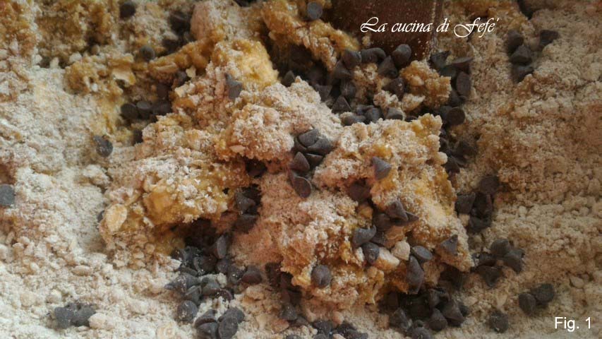 Proceded siguiendo los pasos de la receta base hasta el número 4, eliminando la piel de limón. Empezad a mezclar los ingredientes con una cuchara de madera desde el centro, incorporando poco a poco el resto. Luego trabajad la masa con las manos y añadid las gotas de chocolate al final (fig. 1).