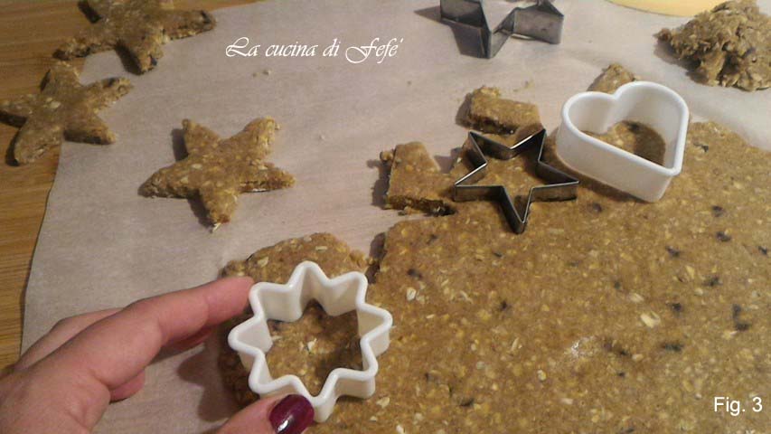 Recoged la masa y estiradla hasta unos 1/2 cm de grosor entre dos hojas de papel de horno. Quitad la hoja superior y recortad las galletas con los cortadores que tengáis a mano (fig. 3).
