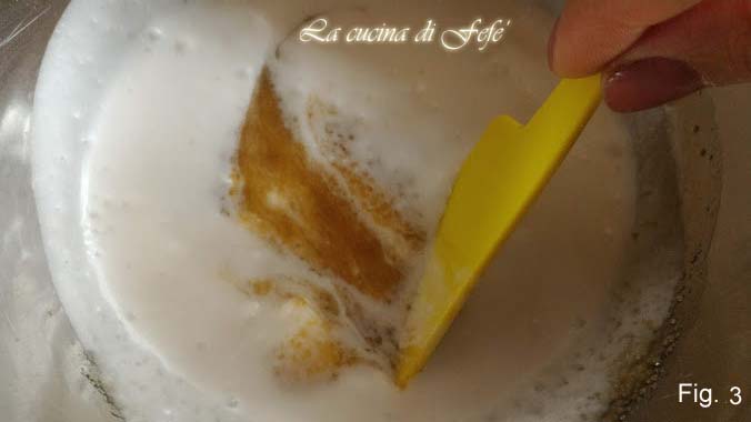 Añade también el aceite de arroz y la leche de coco y mezcla con una espátula (fig. 3).