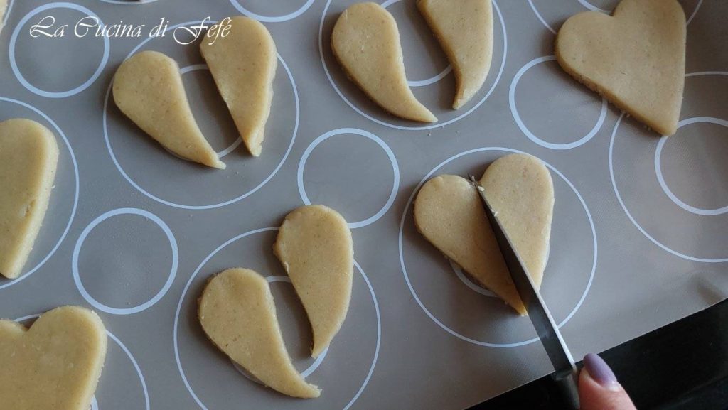 Es importante no llenar demasiado la bandeja en esta fase porque las galletas duplicarán su número. Así que separa ligeramente las dos mitades y, siempre con el cuchillo, moldea cada punta curvándola hacia el interior, teniendo cuidado de no romperla.
