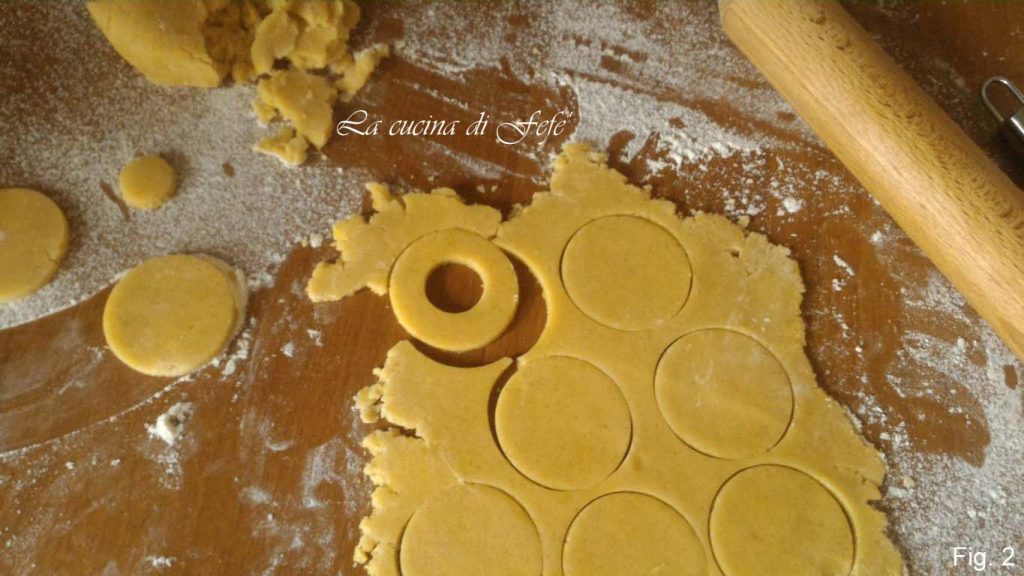 Pasado el tiempo de reposo, extiende la masa con un rodillo sobre una superficie ligeramente enharinada hasta un espesor de 5 mm y, utilizando un cortapastas circular, corta muchos discos, luego haz un agujero central en la mitad de las formas preparadas (fig. 2).