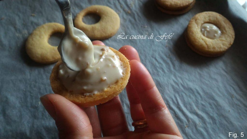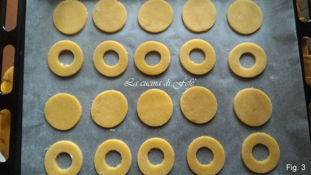 Coloca las galletas en una bandeja de horno forrada con papel de horno y hornea en horno precalentado a 180°C durante aproximadamente 9/10′ o hasta un ligero dorado (fig. 3).